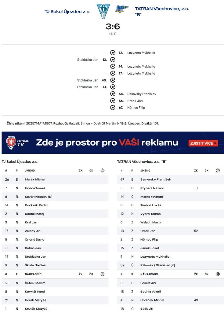 V sobotu 25. dubna odehraje náš tým další mistrovský zápas jarní části soutěžní sezóny 2025/2026. Na pořadu dne je 19. kolo, ve kterém přivítáme na našem hřišti tým TJ Sokol Čekyně, který v minulém kole porazil na svém hřišti Duklu Hranice 3:1 a aktuálně je na 6. místě tabulky s 25 body při skóre 43:50. V podzimním zápase jsme na půdě soupeře zvítězili vysoko v poměru 2:9 (poločas 0:5, 4 x Mykhailo Lozynets, 3 x Stanislav Rakovský, 2 x Valerii Bodnia).